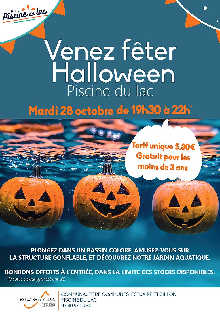 - Venez fêter Halloween : mardi 28 octobre, de 19h30 à 22h, plongez dans un bassin coloré, amusez-vous sur la structure gonflable et découvrez notre jardin aquatique. Bonbons offerts à l'entrée (dans la limite des stocks disponibles). Tarif unique à 5,30€, gratuit pour les moins de 3 ans.