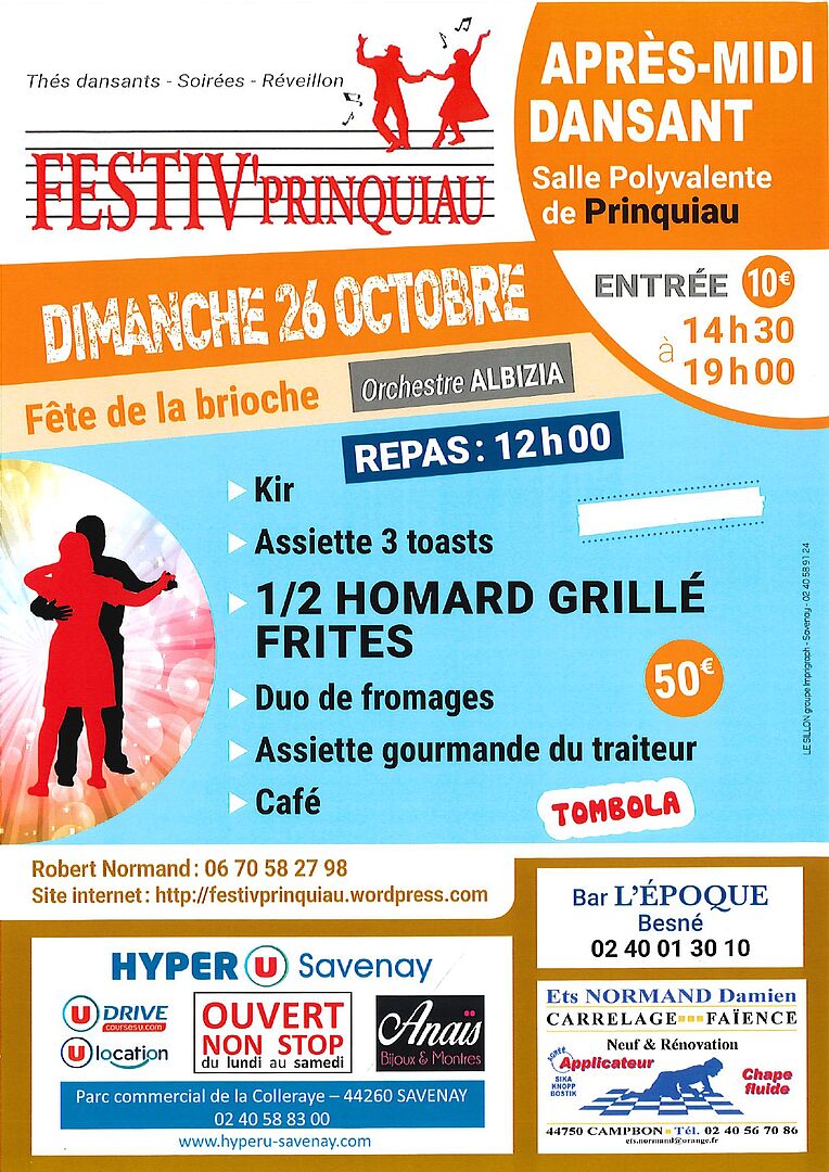 Le26oct. Du 12h00 à 19h00 Association Repas et après-midi dansantSalle polyvalente de PrinquiauAjouter à mon calendrier Repas et après-midi dansantDimanche 26 octobre 2025Salle Polyvalente de PrinquiauOrchestre : ALBYZIAMenu : HomardTarifs : 50€ la journéeAprès-midi dansant seul de 14h à 19h : 10€Sur réservation au 06.70.58.27.98 PrécédentRetour à la listeSuivant